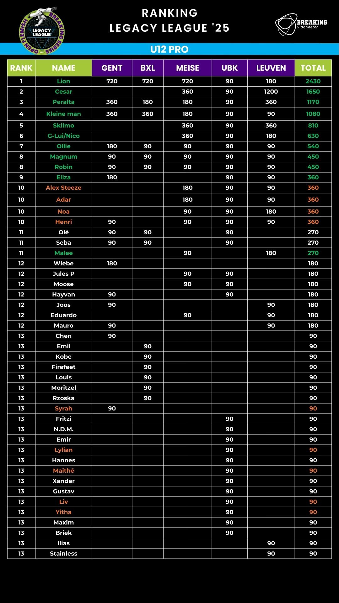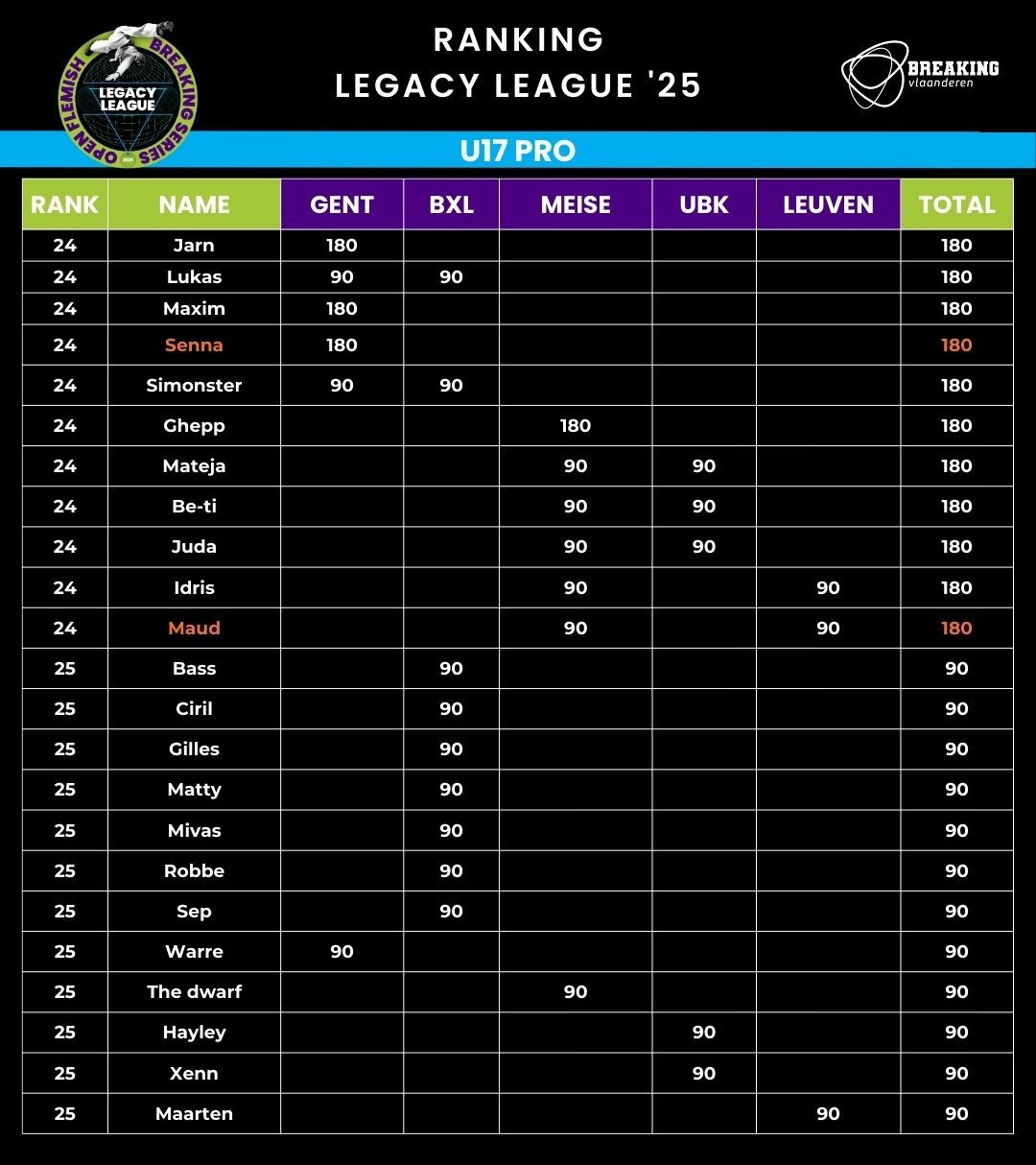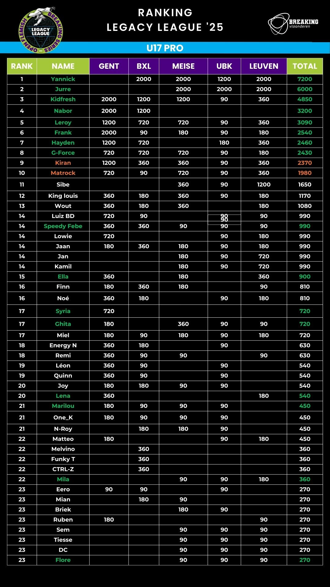 Extra opmerking: Als een bboy of bgirl zich kwalificeert in zowel Vlaanderen als Wallonië (dus in beide rankings voorkomt), kan hij of zij slechts één plek innemen in de eindranking. Daardoor komt er een plek vrij voor de volgende in de lijst.
